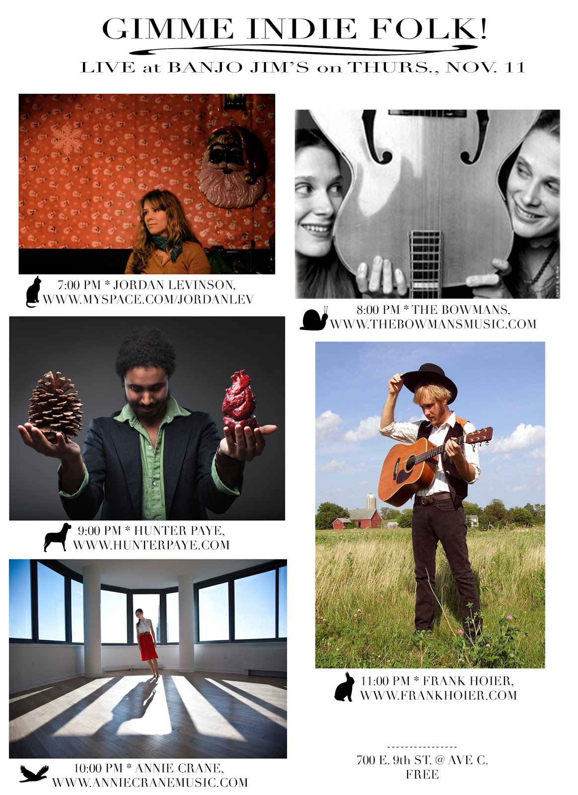 Thursday, Nov. 11th, GIMMIE INDIE FOLK! @ Banjo Jim’s, 700 East 9th St @ Ave. C, NYC, Free. 7pm Jordan Levinson, 8pm The Bowmans, 9pm Hunter Paye, 10pm Annie Crane, 11pm Frank Hoier
