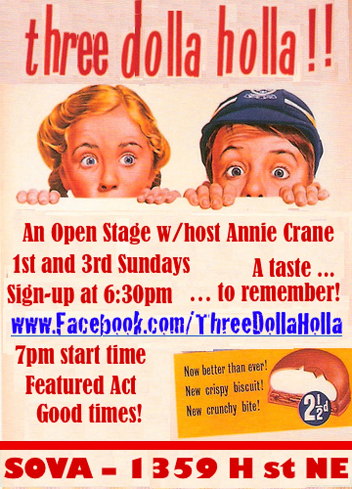 A new event hosted by yours truly... "An open stage with host Annie Crane at the cafe/wine bar, SOVA, in Washington, DC! Sign up is at 6:30pm with the night beginning at 7:00pm. Held on the 1st and 3rd Sundays of every month, the very first Three Dolla Holla will be Sunday, May 6, 2012. Music of all kinds, hip-hop, freestyle, dance, comedy, interpretive anything -- Bring it. Cover: $3, hence the name".